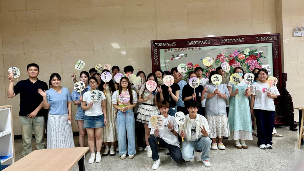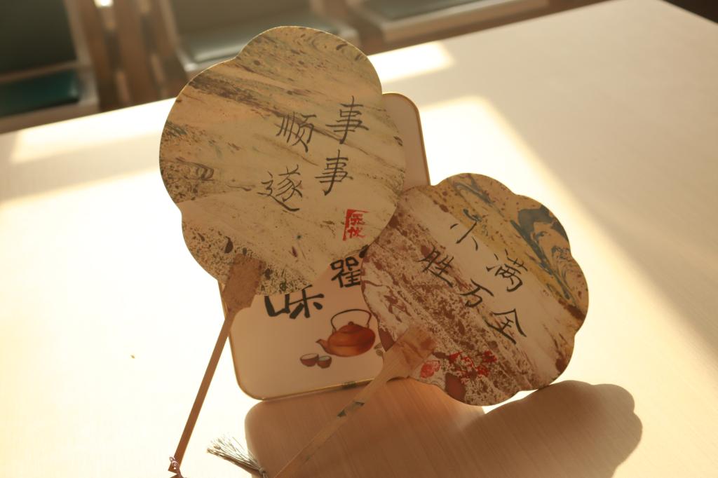 活动中,在图书馆工作人员的指导下,师生们尝试用不同配色及手法,将漆扇放入水中轻摇曳,精心调制的色彩在扇面上穿插交错,流云变换,赋予每柄漆扇独特灵魂,演绎着漆扇的诗情画意。图书馆老师与书画协会成员现场为扇面泼墨挥毫,古朴诗句、美好祝福为漆扇增添了雅致情趣之美。