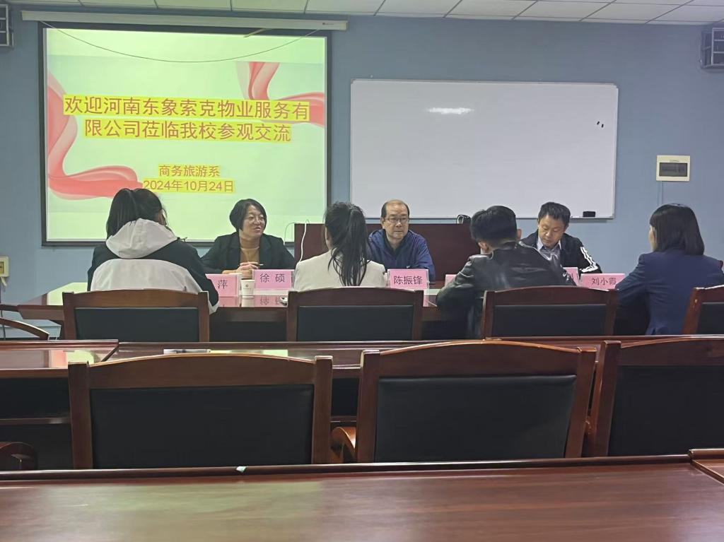 10月24日,河南东象索克物业服务有限公司董事长庞哲、副总经理李晓雨、综合经理刘小霞一行到商务旅游系进行校企合作座谈交流。商务旅游系主任徐硕、党总支书记陈振锋、现代物业管理教研室负责同志陪同并参加座谈会。