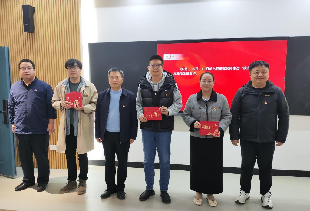 教工党支部书记刘向杰为3位过“政治生日”的教师党员发放“政治生日”贺卡,送上“生日寄语”,提醒党员们时刻牢记初心使命,以共产党员的实际行动勇当时代先锋。全体党员起立奏唱《国际歌》,刘向杰为预备党员授戴党员徽章,并带领预备党员与老党员面向党旗庄严宣誓。