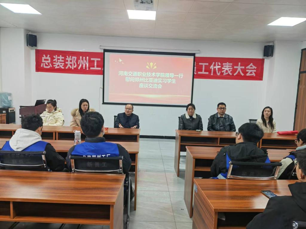 12月29日,汽车学院副院长杨长征带领学院教师及辅导员代表一行五人前往郑州比亚迪汽车有限公司,实地考察正在实习的70余名新能源汽车技术专业学生的学习和生活情况,并召开了座谈会。