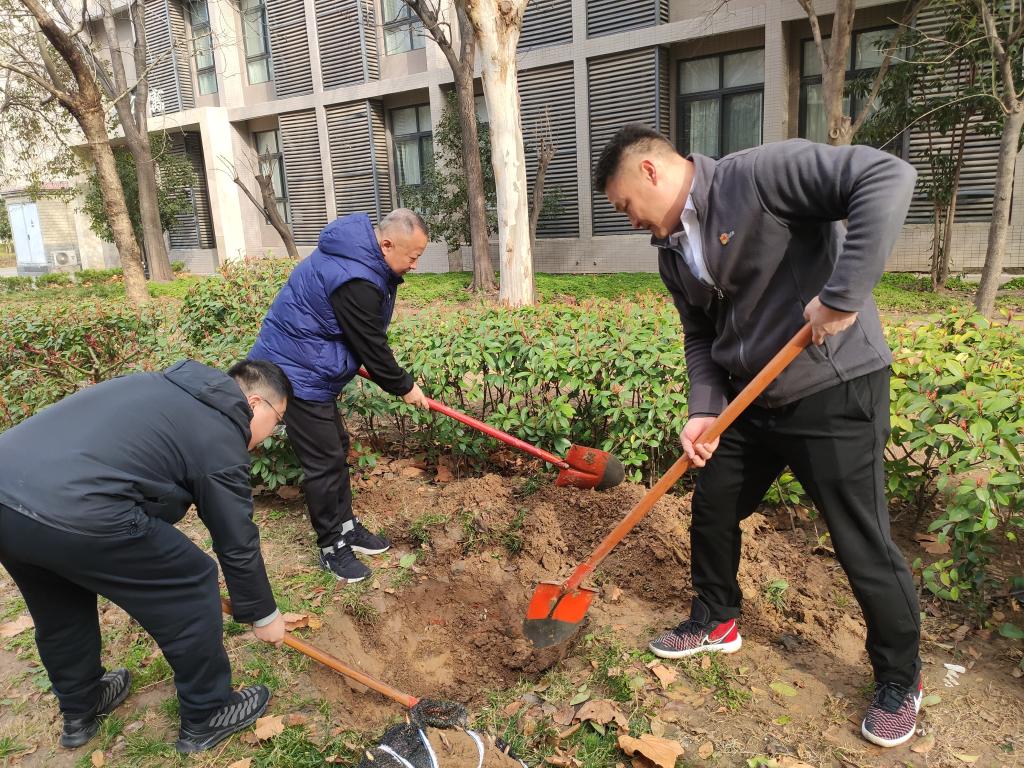 活动伊始,支部书记程志立阐述了红梅所蕴含的坚韧高洁精神与党员品质的契合之处,鼓励大家在活动中感悟初心,以实际行动践行党员的先锋模范作用。随后,专业园艺师现场讲解红梅的种植要点,党员们认真聆听,热情高涨。在专业人员的指导下,大家分工明确,挥锹铲土、扶苗填坑、提水浇灌,每一个环节都认真细致,现场一片热火朝天的劳动景象。大家相互协作,充分发挥团队精神,现场洋溢着团结奋进的氛围。