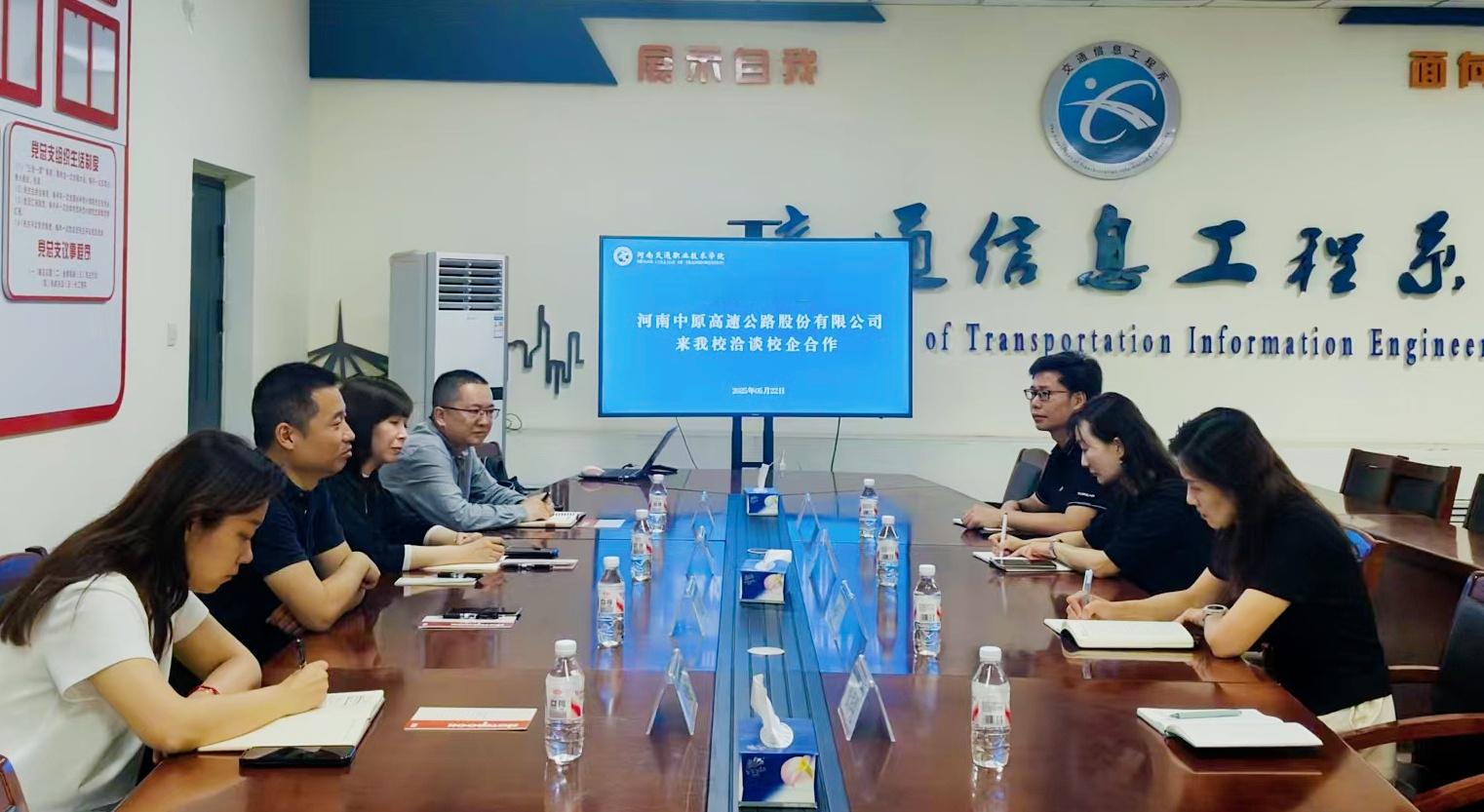 5月22日,河南中原高速公路股份有限公司党委副书记马骏一行4人到访学校交通信息工程系,双方围绕校企合作、人才培养等议题进行深入交流。
