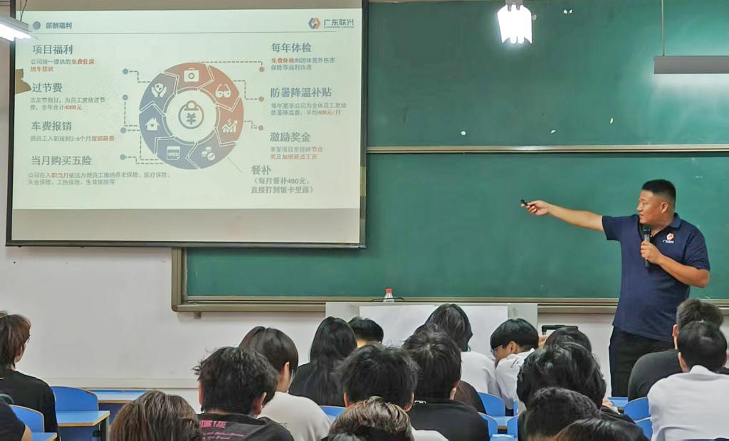 会上,广东联兴建设有限公司华中区经理王中良全面阐述了企业成长轨迹、核心价值观、管理体系、经营领域,以及岗位需求、员工薪酬待遇及职业发展等内容。互动环节,同学们踊跃提问,围绕岗位职责、职业前景、学习发展等话题与招聘宣讲人深入交流,工作人员逐一解答,现场氛围热烈融洽。