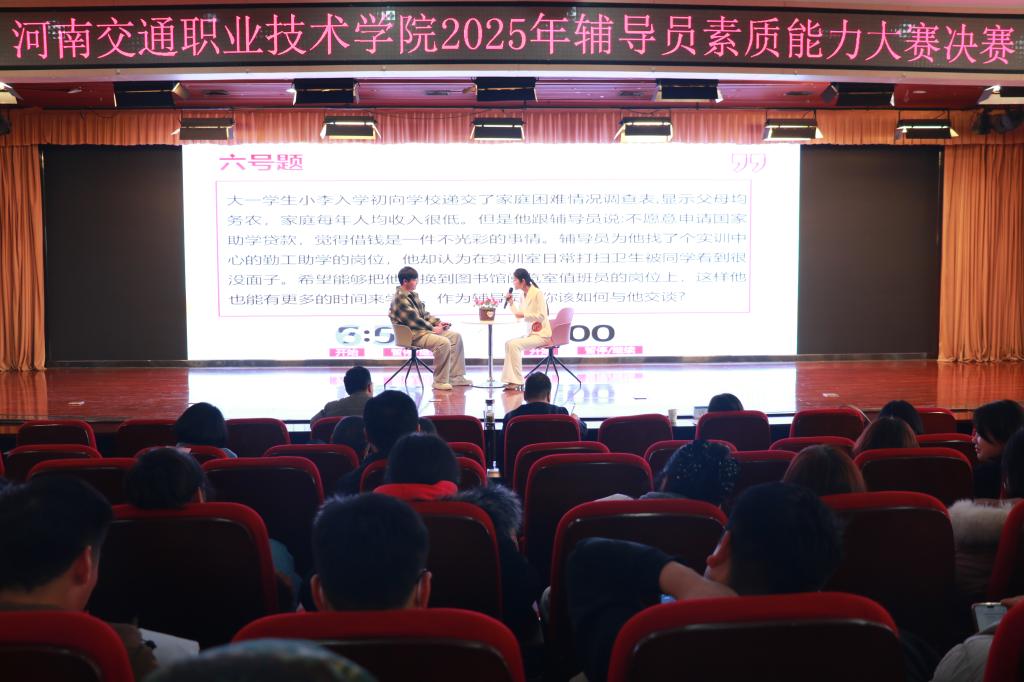大赛共设基础知识测试、案例研讨、谈心谈话三个环节,全面考察辅导员理论素养和业务知识掌握情况。48位辅导员参加笔试和案例研讨,12位成绩优异者晋级进入谈心谈话决赛环节。决赛现场,参赛选手们紧紧围绕辅导员工作“九大职责”与助演学生精准模拟日常学生工作中的各类场景。从学生成长诉求出发,找准问题根源,梳理谈话逻辑,循循善诱,化解矛盾,给予学生正确的思想引导,充分展现了辅导员丰富的实践经验与沟通引导能力,彰显了“立德树人”过程中“知心人、引路人”的责任担当。