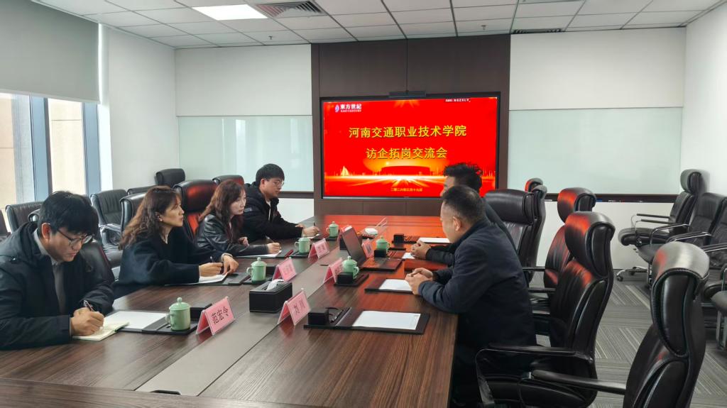 在东方世纪科技股份有限公司,企业相关负责人介绍了公司发展、核心业务及人才需求,重点表达了合作开展订单班的意愿。田保慧介绍了交通信息工程系专业建设、人才培养相关情况,双方围绕订单班培养、学生岗位实习等细节深入交流,达成初步合作意向。