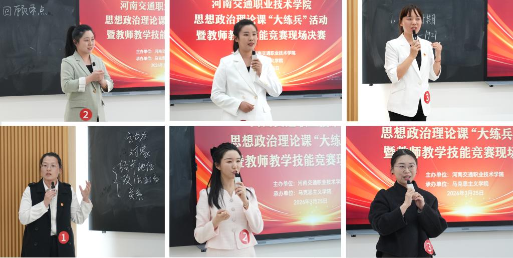 3月25日,由马克思主义学院主办的学校2026年思想政治理论课“大练兵”活动暨教师技能竞赛现场决赛在郑东校区顺利举行。学校专兼职思政课教师在同台竞技中展示教学风采,锻造专业能力,进一步推动学校思想政治理论课改革创新,全面提升思政课教学质量。